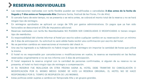 • Reservas realizadas con tarifa No Reembolsable NO PUEDEN SER CANCELADAS O MODIFICADAS ni tienen ningún
