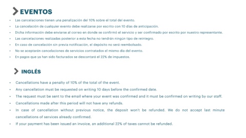 • La cancelación de cualquier evento debe realizarse por escrito con 10 días de anticipación.